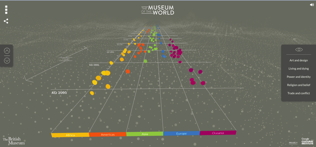 With the use of simple controls and sound effects, the Museum of the World shows a timeline of world for students to travel through through the incorporation of theses such as: arts, culture, trade, society, and life at the time. After clicking one of the dots, students are able to read or listen about the artifact they chose, its location, and its importance to history. Although this example is not the British Museum itself, it does show a virtual museum for students to travel through and learn about fun and interesting exhibits within the museum itself.